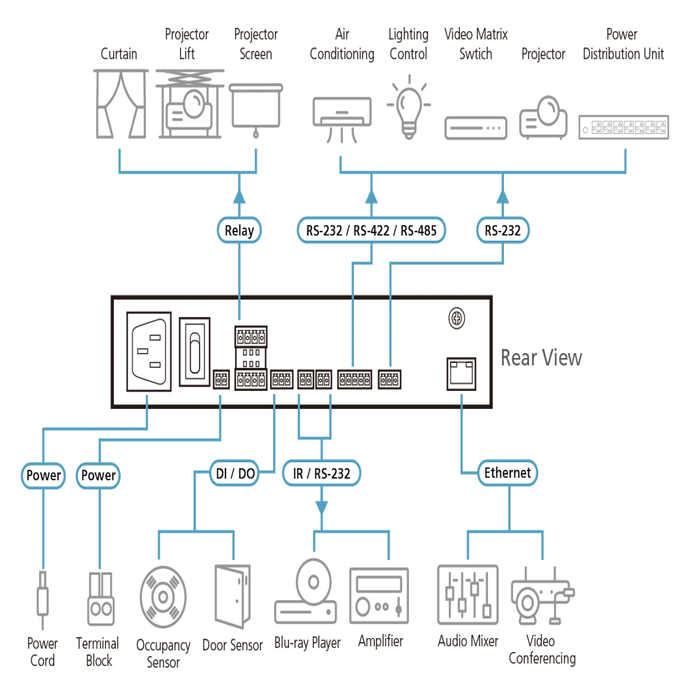 • תומך בשליטה דרך RS-232/485/422, IR, ממסרים, I/O דיגיטלי ורשת